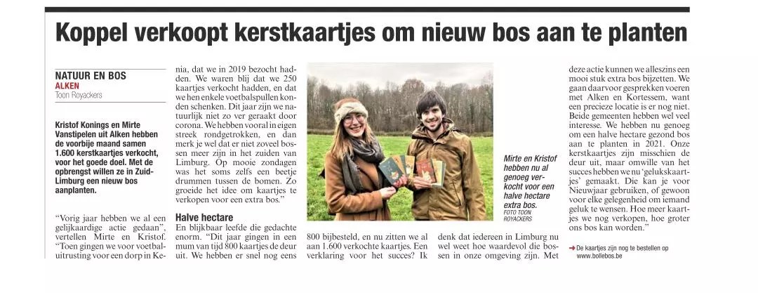 Bollebos, dat zijn 3 vrienden, Mirte Evi en Kristof, die enkele jaren geleden begonnen met zich in te zetten voor meer bos in onze streek. Na hulp van vele mensen konden we samen duizenden bomen planten in Haspengouw. Het Bollebos in Hoeselt is ondertussen een verborgen parel geworden waar mensen ontmoeten en genieten van de natuur.